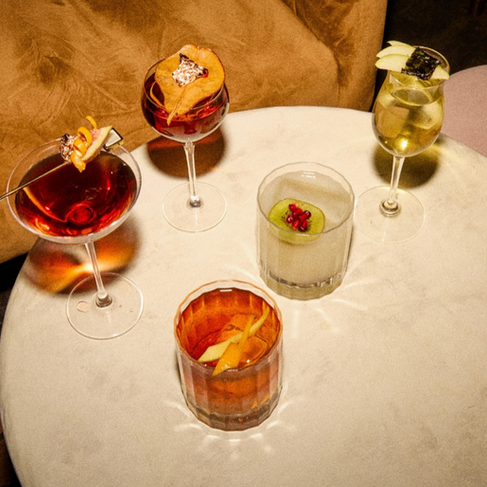 The Slow Sippers section completes the menu with spirit-forward options crafted for depth and balance. Notable offerings comprise Shades of Green, which amalgamates nori and apple with sherry and Irish whisky, and G.G., a bittersweet Manhattan that fuses high-proof rye, Spanish brandy, vermouth and sherry, adorned with a gold foil fig garnish.