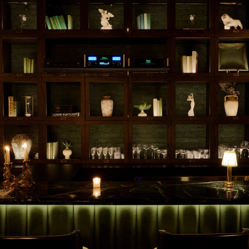 A connected lounge features curving banquettes, olive and white velvet armchairs, and marble-topped tables, adorned with hand-painted gold leaf mirrors and vintage-inspired wallpaper. Preserved dandelions and an early edition of Great Expectations are present throughout the space, while a complete wall of large-scale mixed media pieces by Mexican artist Leopoldo Goút serves as the focal point of the room. A McIntosh audio system enhances the ambiance.
